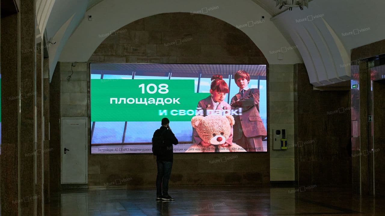 Компания Future Vision изготовила и установила светодиодный экран на станции метро «1905 года» в городе Екатеринбург, который расположен прямо в зоне ожидания поездов — там, где пассажиры проводят несколько минут в статике, и визуальный контент работает особенно эффективно.